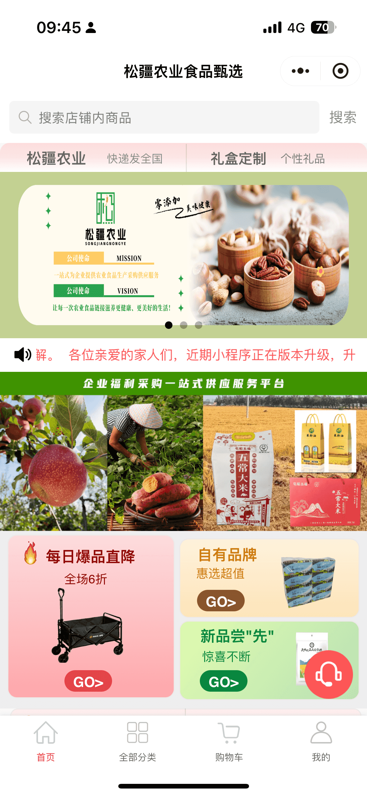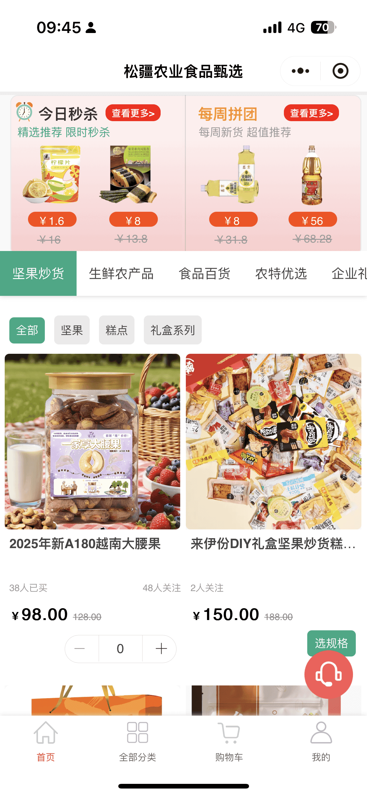 “松疆农业食品甄选”小程序通过“秒杀+拼团”引流、“会员+积分”留存,结合爆品与礼盒提升客单价,并构建B2C与B2B双轮驱动模式,形成了一套高效推动农产品销售的电商体系。以下是对其功能与玩法的详细解析: