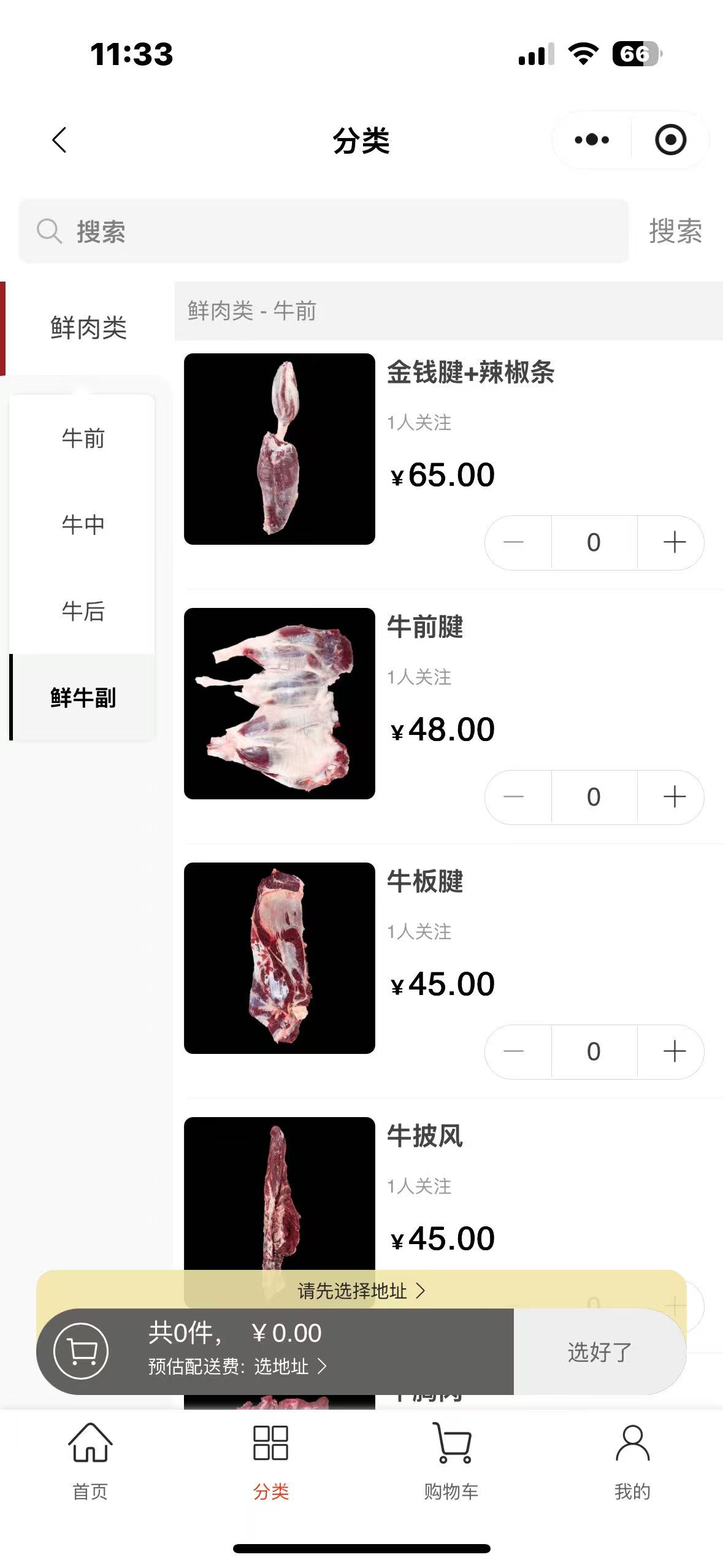 分类导航:按部位(如牛排、牛腩、牛腱)、烹饪方式(煎、炖、烤)、新鲜度(当日宰杀、冷鲜)等维度分类,便于用户快速定位需求。