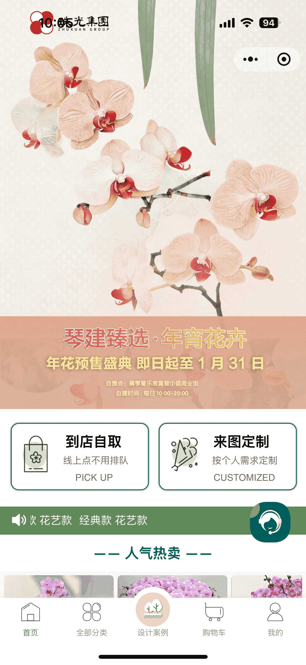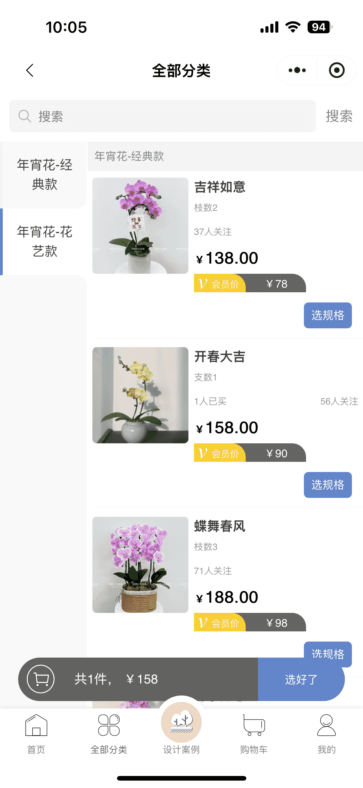年宵花专区:按节日场景(春节、元宵节)和花材类型(蝴蝶兰、大花蕙兰、水仙)分类展示,支持按价格区间、寓意(吉祥、招财)筛选。例如,用户搜索“红色系年宵花”可快速定位红掌、朱顶红等商品。