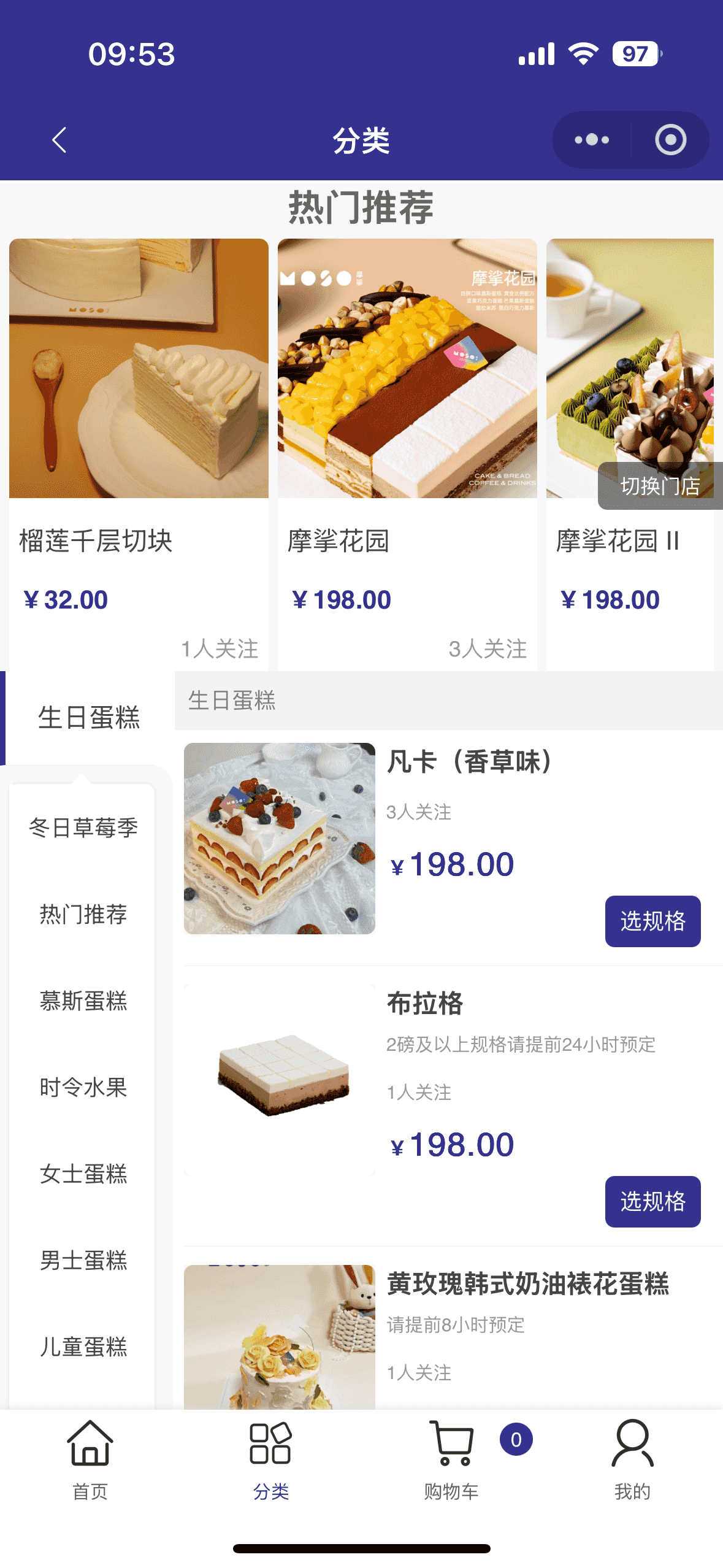 功能实现:支持按口味(如巧克力、抹茶)、种类(蛋糕、泡芙)、规格(单人份、家庭装)等多维度分类,用户可快速定位目标商品。