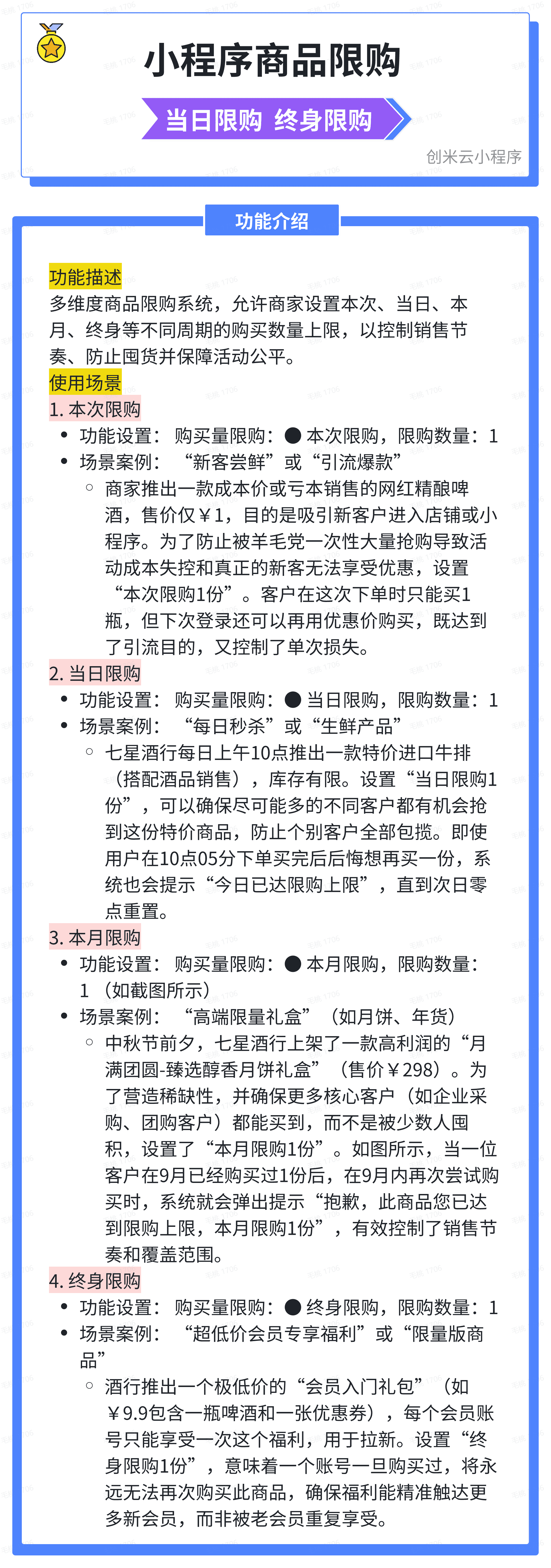 终身限购:用于稀缺商品或会员专属权益,强化用户忠诚度。