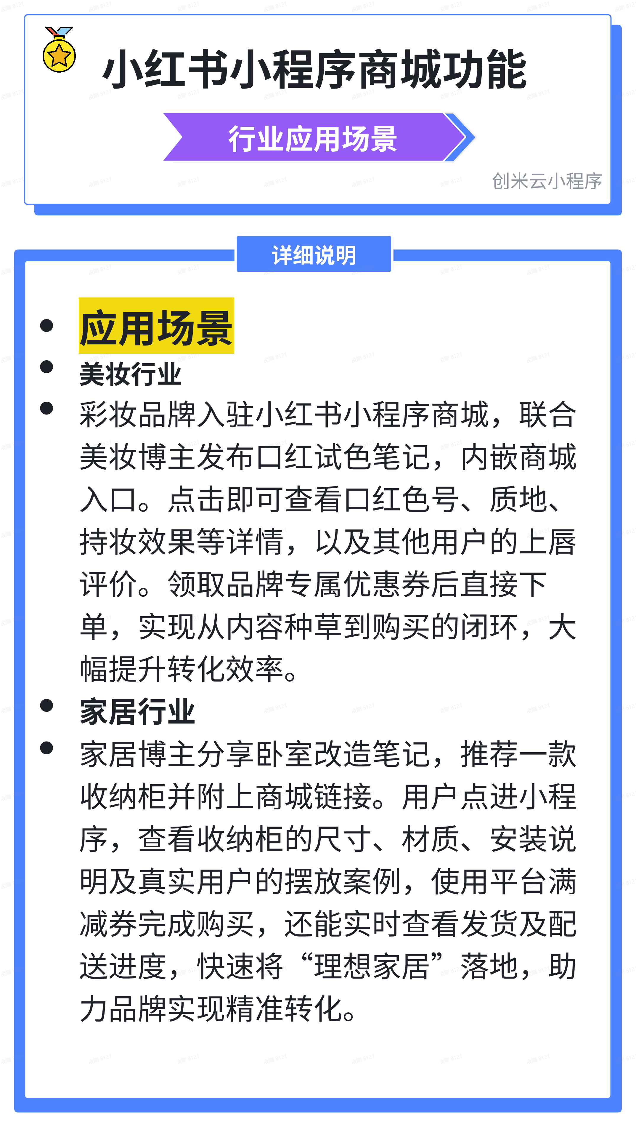 创米云小程序通过模拟小红书的“内容种草+即时转化”模式,将商品展示、用户评价、交易流程深度整合,实现以下核心价值: