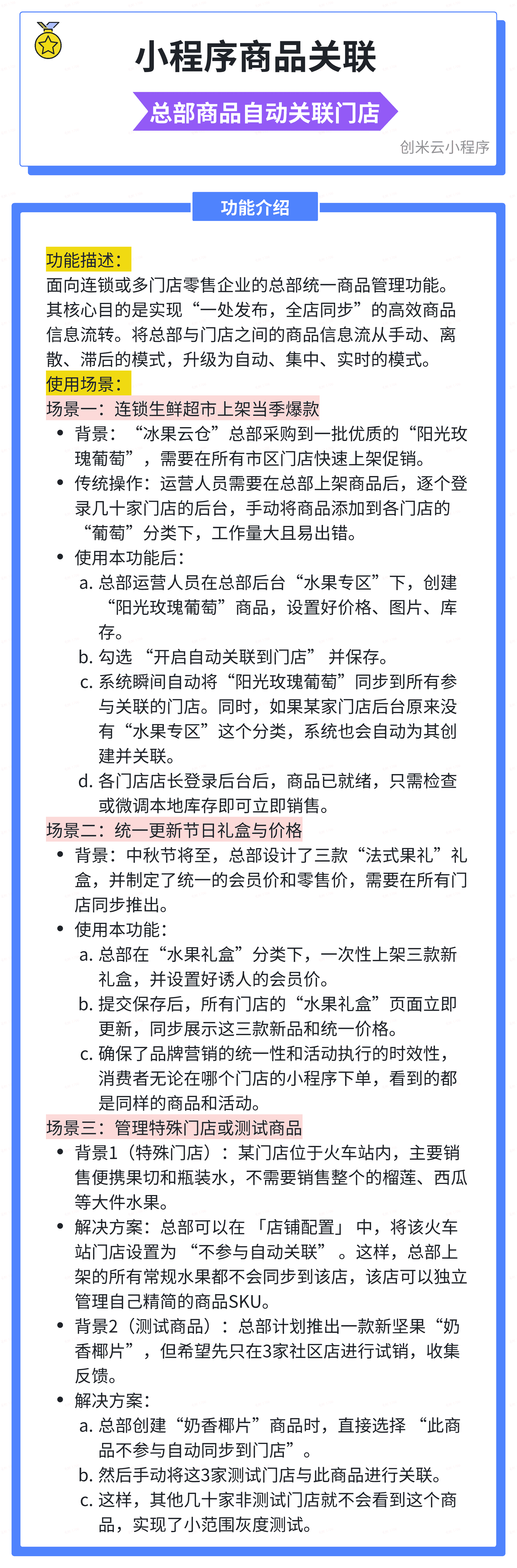 基于数据的自动匹配:通过分析历史销售数据、门店客群特征,自动推荐商品与门店的关联关系(如“A商品在华南区门店销量高,建议优先关联”)。