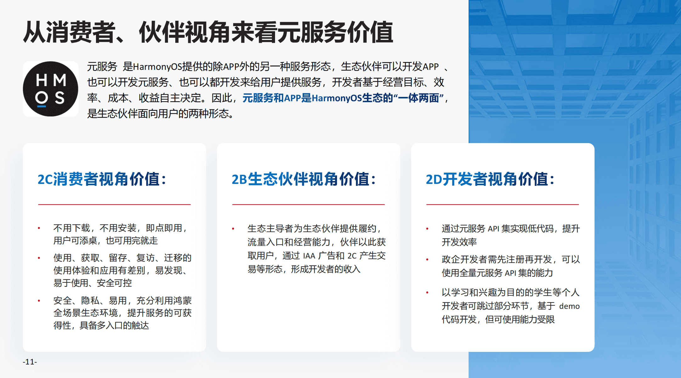 最近很多人问华为鸿蒙元服务是什么?华为鸿蒙元服务是 HarmonyOs生态中的一种无需安装、即点即用的轻应用形态。它是长在手机里的“小程序”,不用下载,在负一屏、语音助手等入口一键直达。现在加入,等于抢占新流量入口的红利期,华为会给优质服务推流。