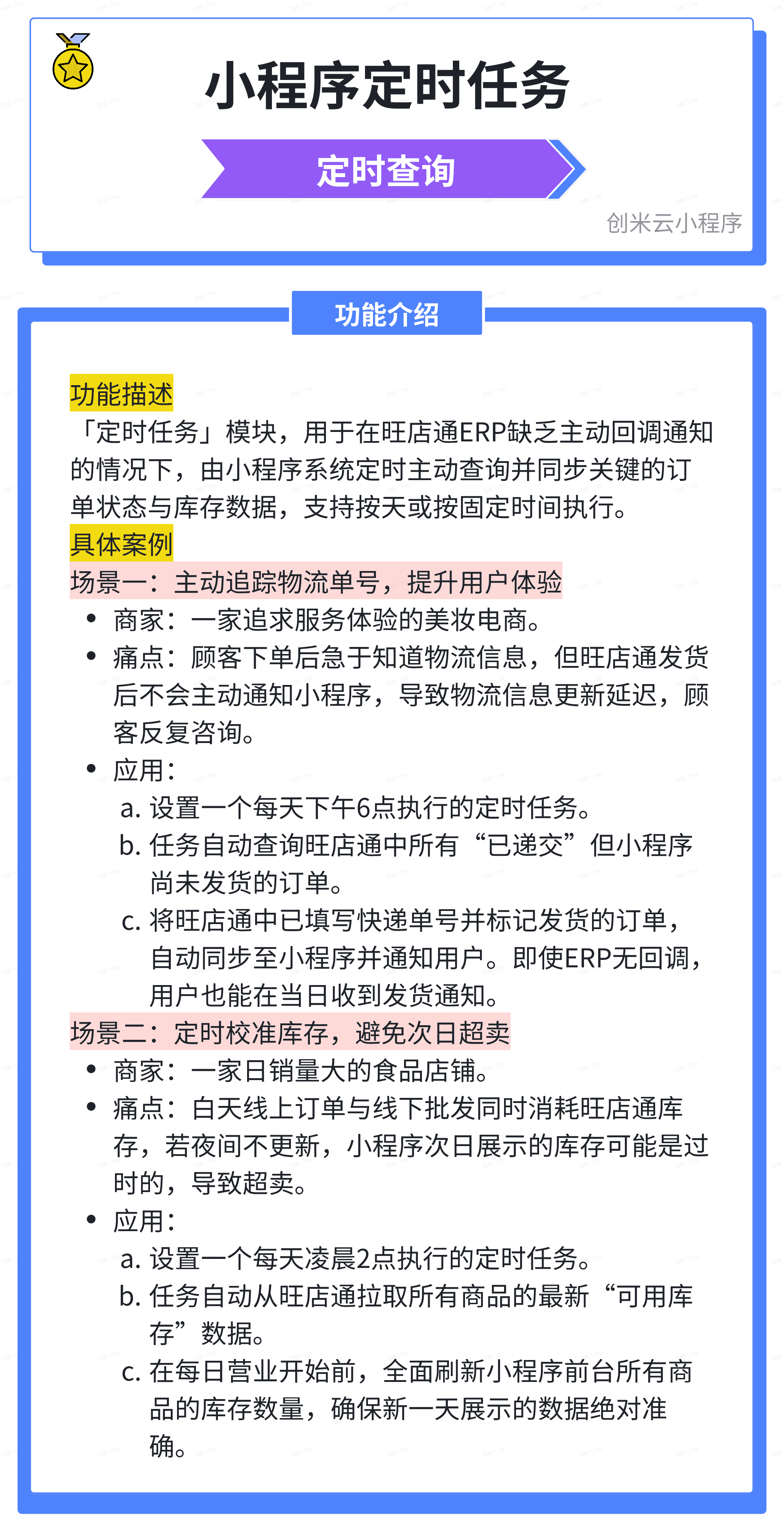 通过“定时任务”模块,小程序可实现与旺店通ERP的高效数据同步,即使缺乏主动回调通知,也能保障业务数据的实时性与准确性,提升运营效率与用户体验。