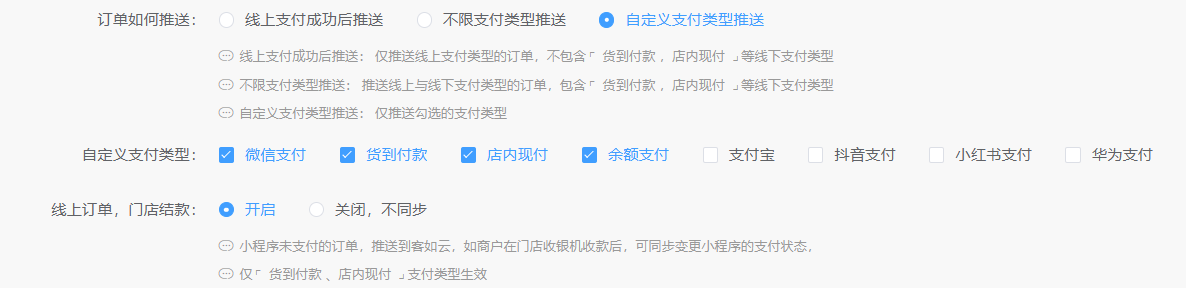 商户可在后台配置中勾选需要推送的支付类型(如货到付款、微信支付、支付宝等),未勾选的支付类型订单将不会同步至客如云系统。例如: