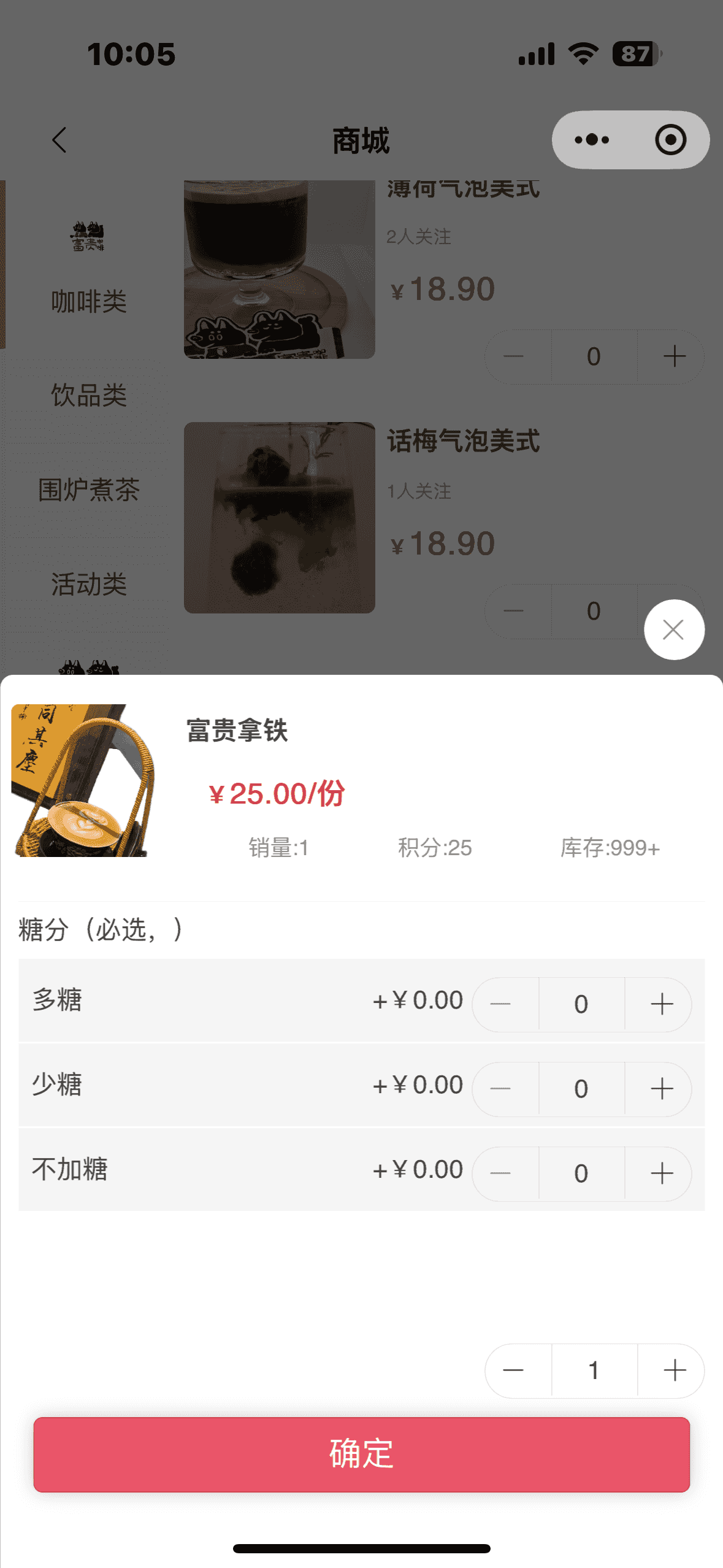 功能概述:在店内堂食时,用户可在小程序上根据自己的口味偏好自定义咖啡的做法,包括甜度(如无糖、少糖、正常糖、多糖)、温度(如热饮、常温、去冰、少冰)、浓度(如淡、正常、浓)等。