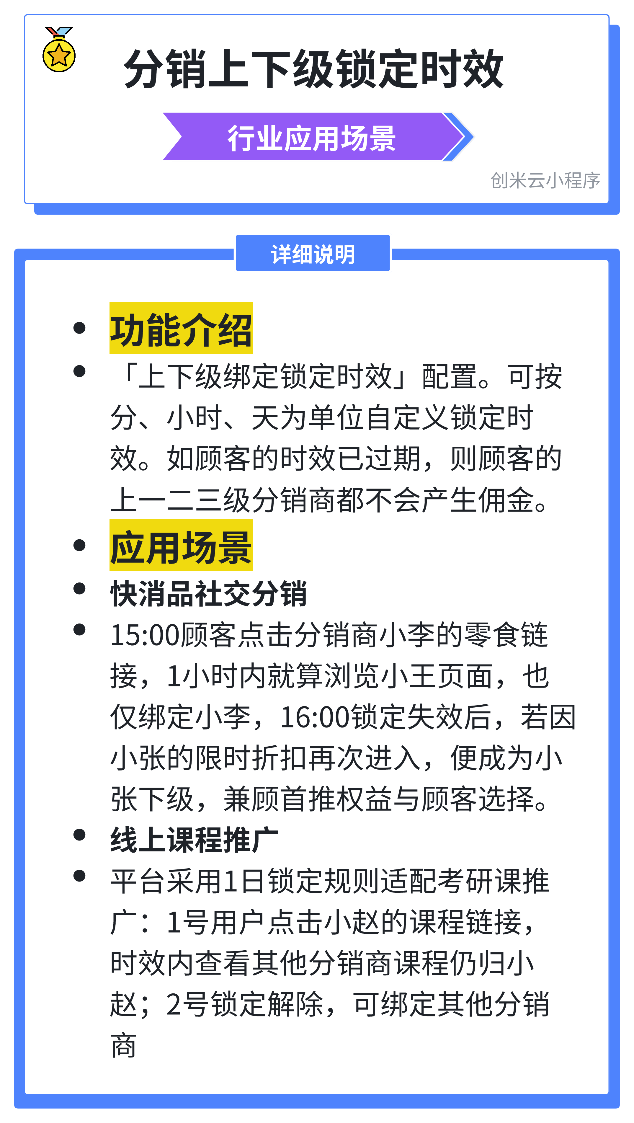 动态锁定:按固定周期(如30天)自动续期,需满足条件(如下级持续消费),适合激励推广者持续运营。