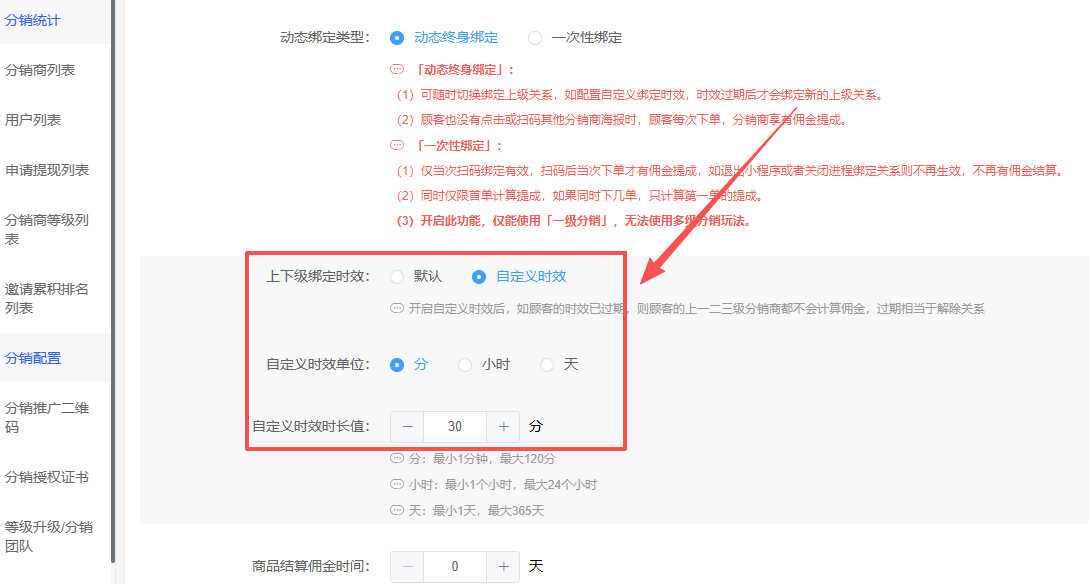 通过自定义绑定时效,商家可避免推广者“躺赚”或用户被长期垄断。例如,设置短期绑定时效(如24小时)可刺激推广者短期内集中拉新,而长期绑定(如终身锁定)则适合高复购型产品(如会员服务),确保推广者持续获得收益。