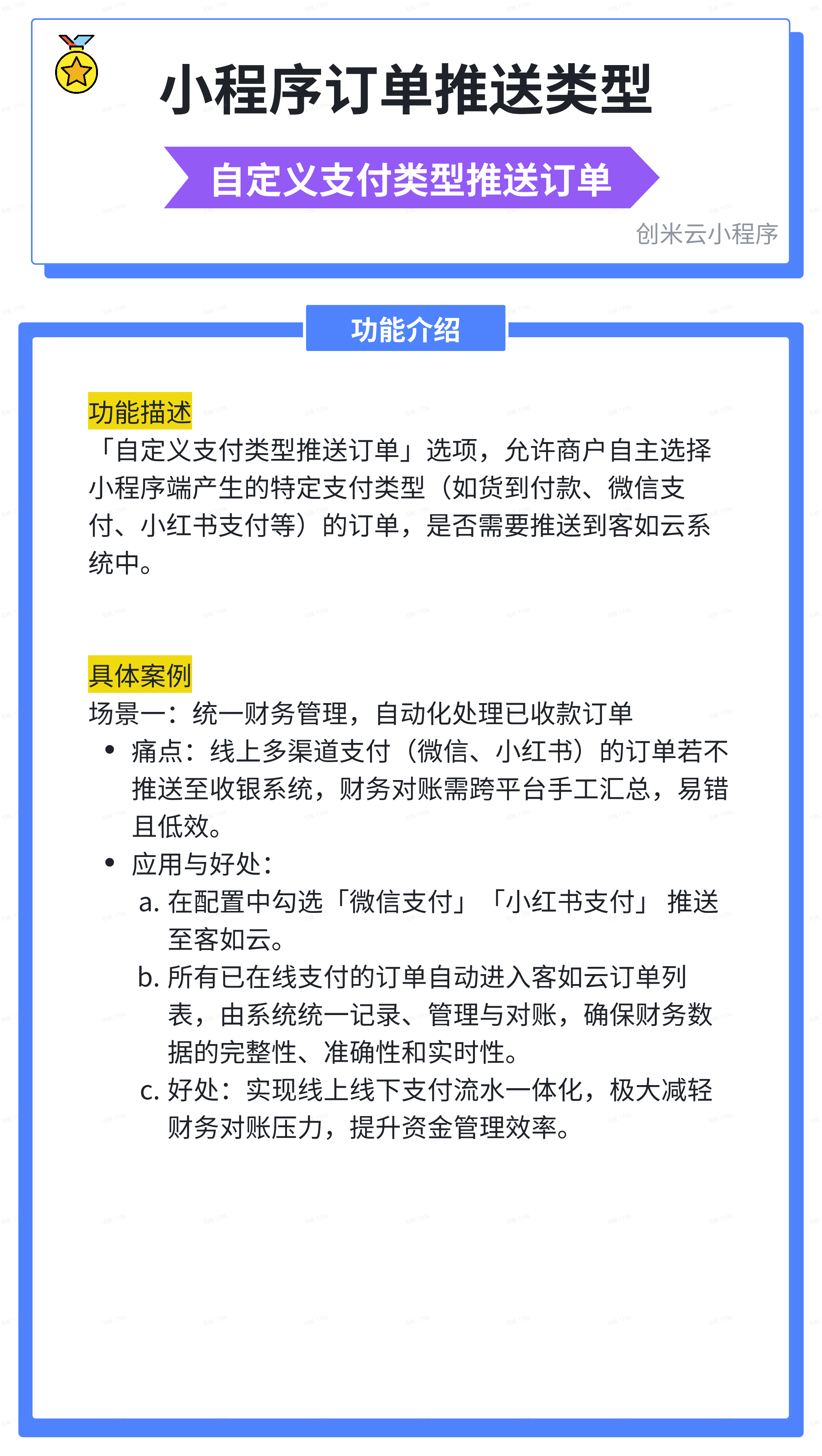 「自定义支付类型推送订单」功能允许商户自主选择是否将小程序端特定支付类型的订单推送到客如云系统,这一功能具有灵活配置、数据同步、业务适配和提升效率等核心价值,商户可根据自身业务需求灵活启用或关闭推送。 以下是对该功能的详细解析与玩法说明: