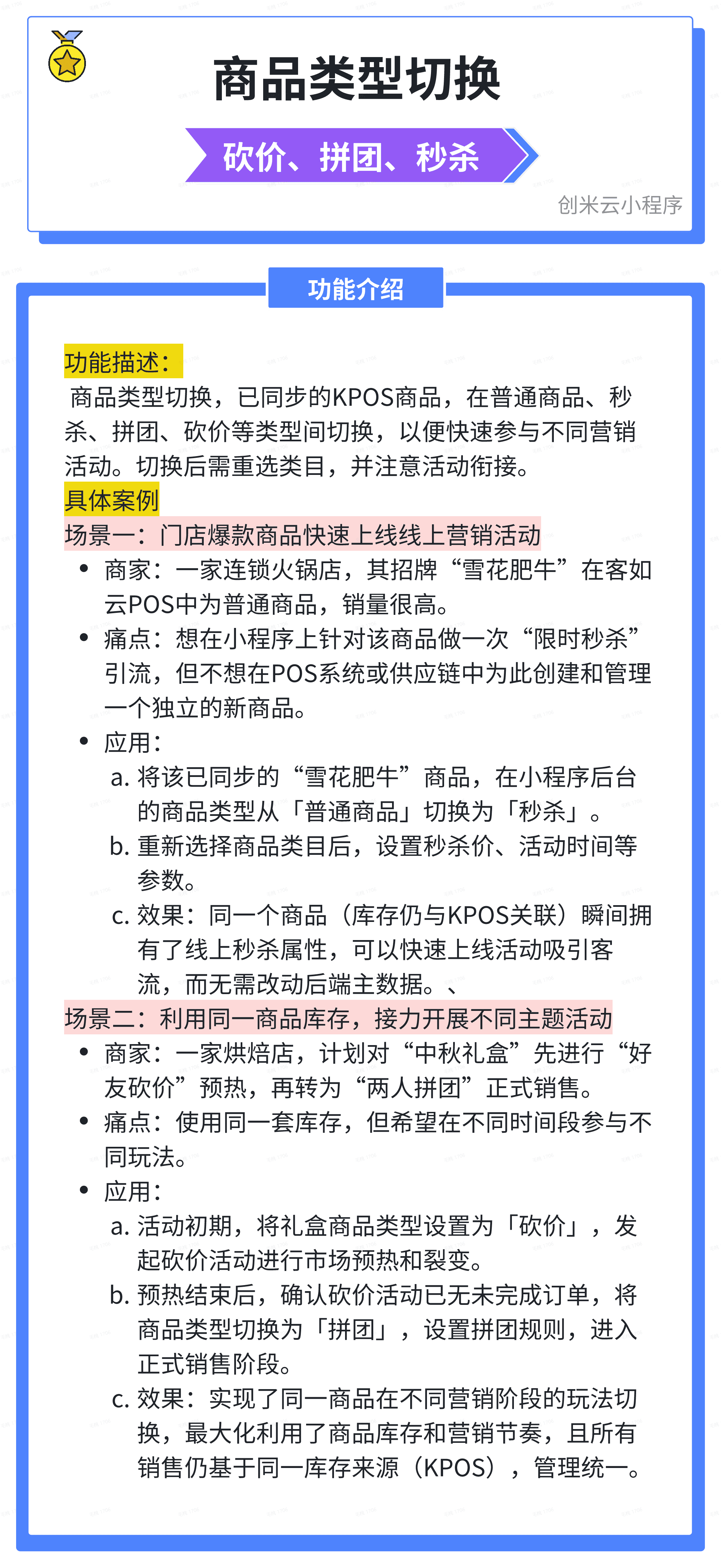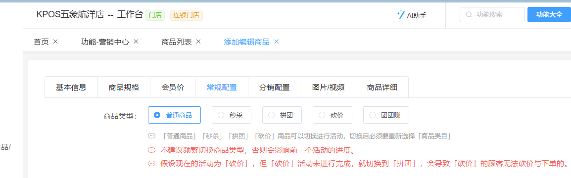 商品类型切换功能允许已同步至KPOS(一种可能的销售点系统或电商管理平台)的商品在不同营销类型之间进行灵活转换。这些营销类型包括但不限于普通商品、秒杀商品、拼团商品和砍价商品。通过这一功能,商家可以快速调整商品参与的营销活动,以适应市场变化和消费者需求。