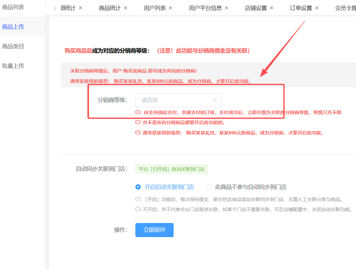 用户购买指定商品后,自动升级为对应等级分销商,解锁该等级的权益(如佣金比例、专属折扣、培训资源等)。