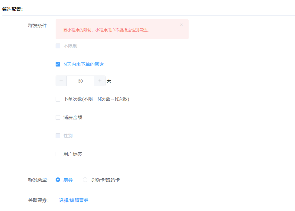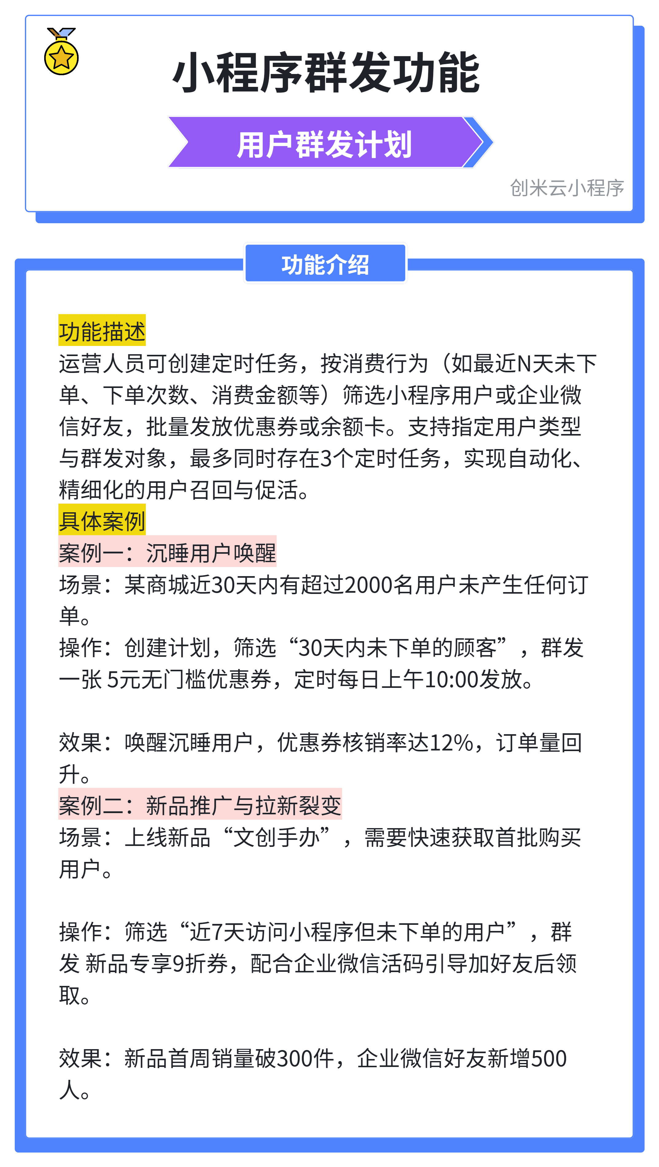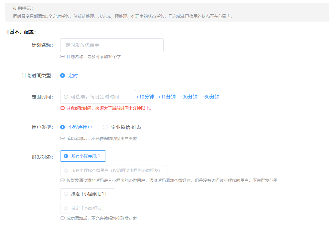 【创米云小程序——功能分享】用户群发计划,是一个支持定时、定向批量发放优惠券(或余额卡)的运营工具,并可对接企业微信进行消息触达,用于精准唤醒或促活用户。