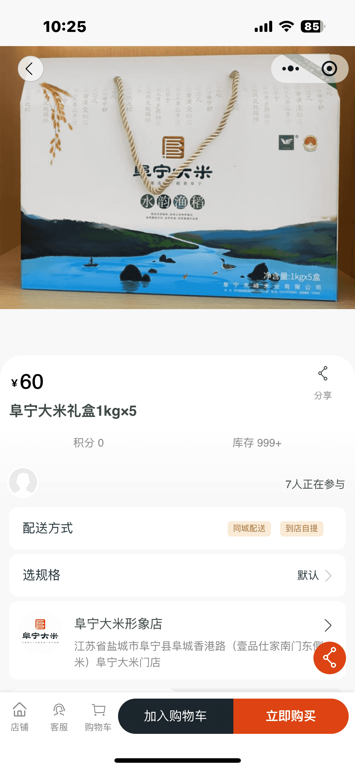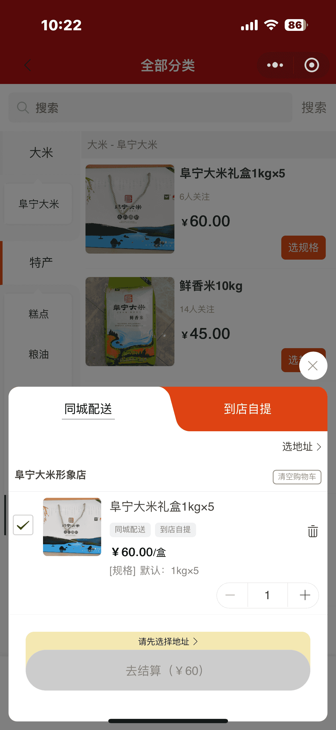 浏览首页分类图标→点击“阜宁大米”进入专区。