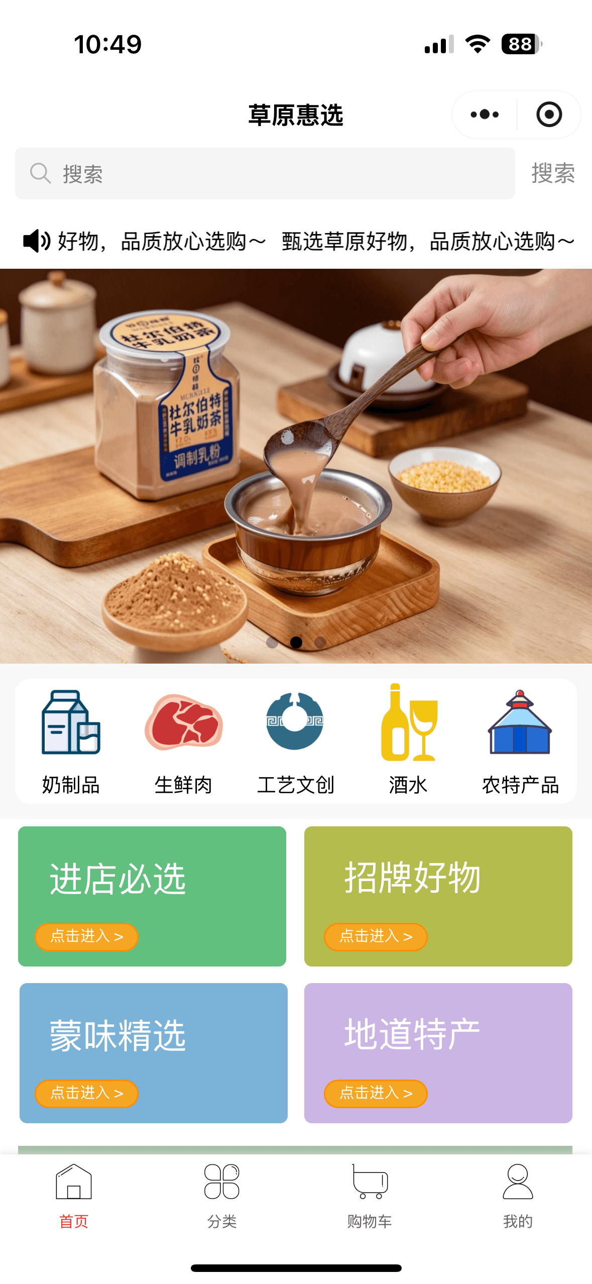 作为草原特色好物的一站式电商平台,“草原惠选”小程序以“甄选地道草原特产,传播民族文化”为核心,通过多元功能设计满足用户购物、文化体验与社交分享需求。以下从功能架构与玩法创新两方面展开解析: