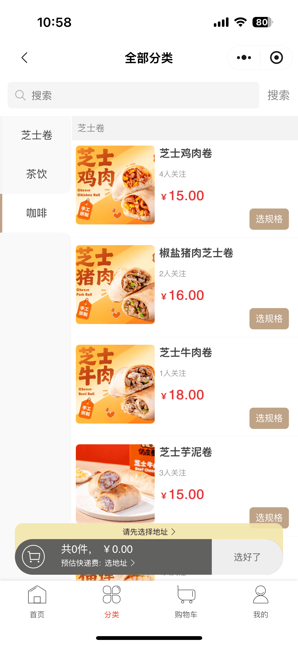 浏览菜单:通过分类导航快速找到芝士卷、茶饮等商品,查看详情(如口味、价格、热量)。