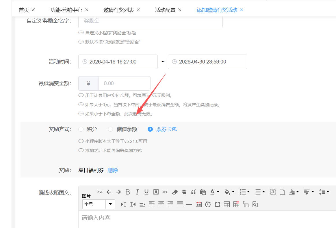 新增的邀请有奖功能突破了以往单一的奖励模式,能够灵活地发放积分、储值余额以及票券卡包这三种不同类型的奖励。积分可用于兑换商品或服务,储值余额能直接在门店消费使用,票券卡包则可能包含折扣券、满减券、礼品券等多种形式,满足不同用户对于奖励的多样化需求,提升了用户参与邀请活动的积极性。