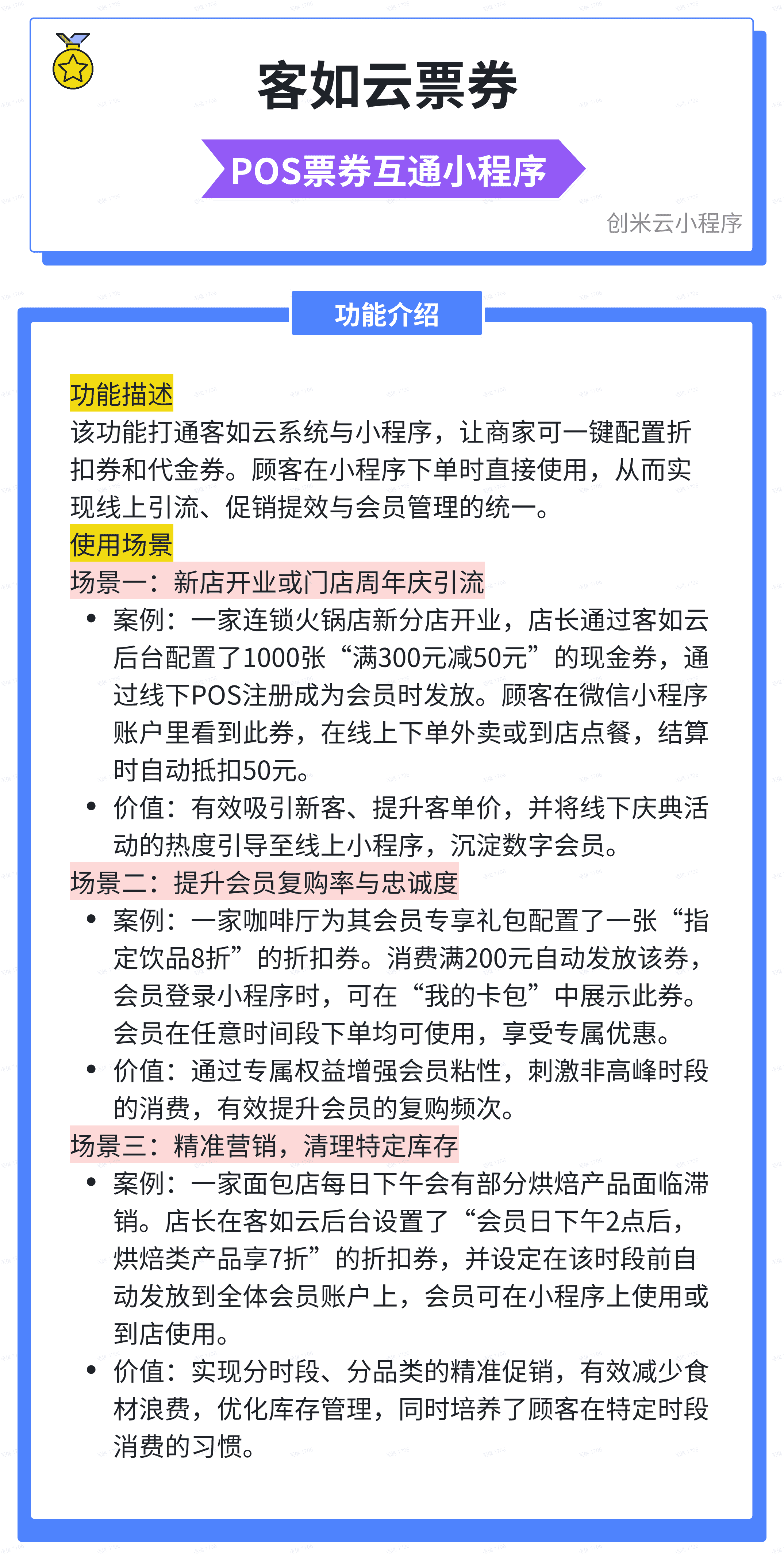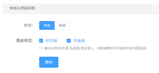 商家操作:商家在客如云系统中完成折扣券和代金券的一键配置,设置好票券的类型(折扣券设定折扣比例,代金券设定固定减免金额)、使用条件(如满多少金额可用)、有效期等信息。配置完成后,票券信息会自动同步至小程序。