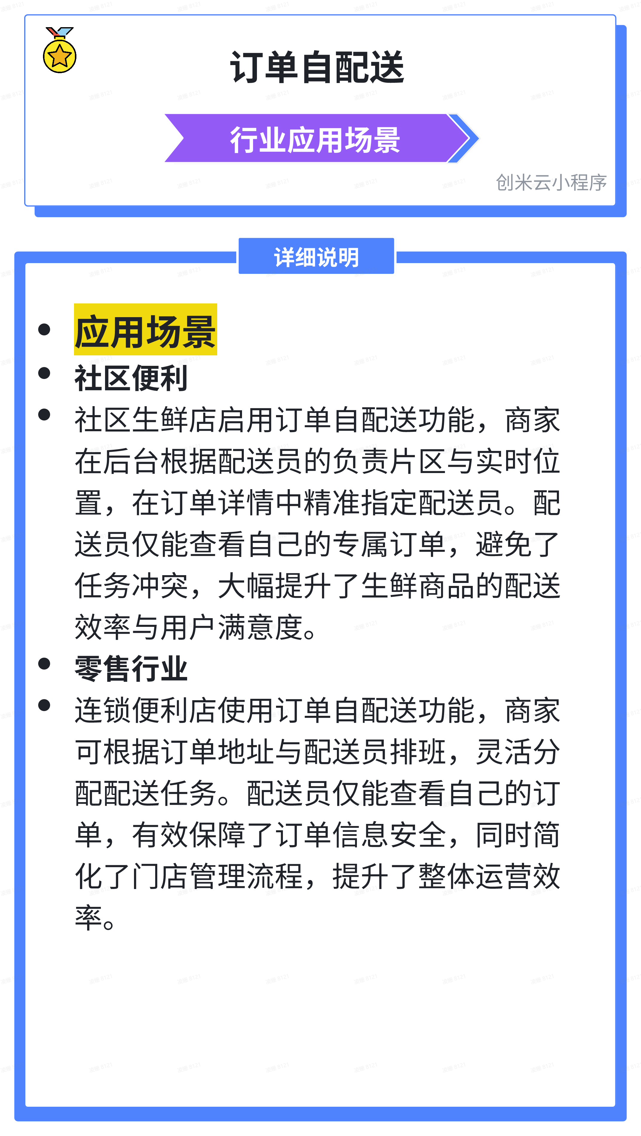 【创米云小程序——功能分享】订单自配送,商家可在订单详情中指定配送员,配送员仅能查看与处理自己的专属订单,实现配送任务精准分配,提升配送效率与管理规范性。