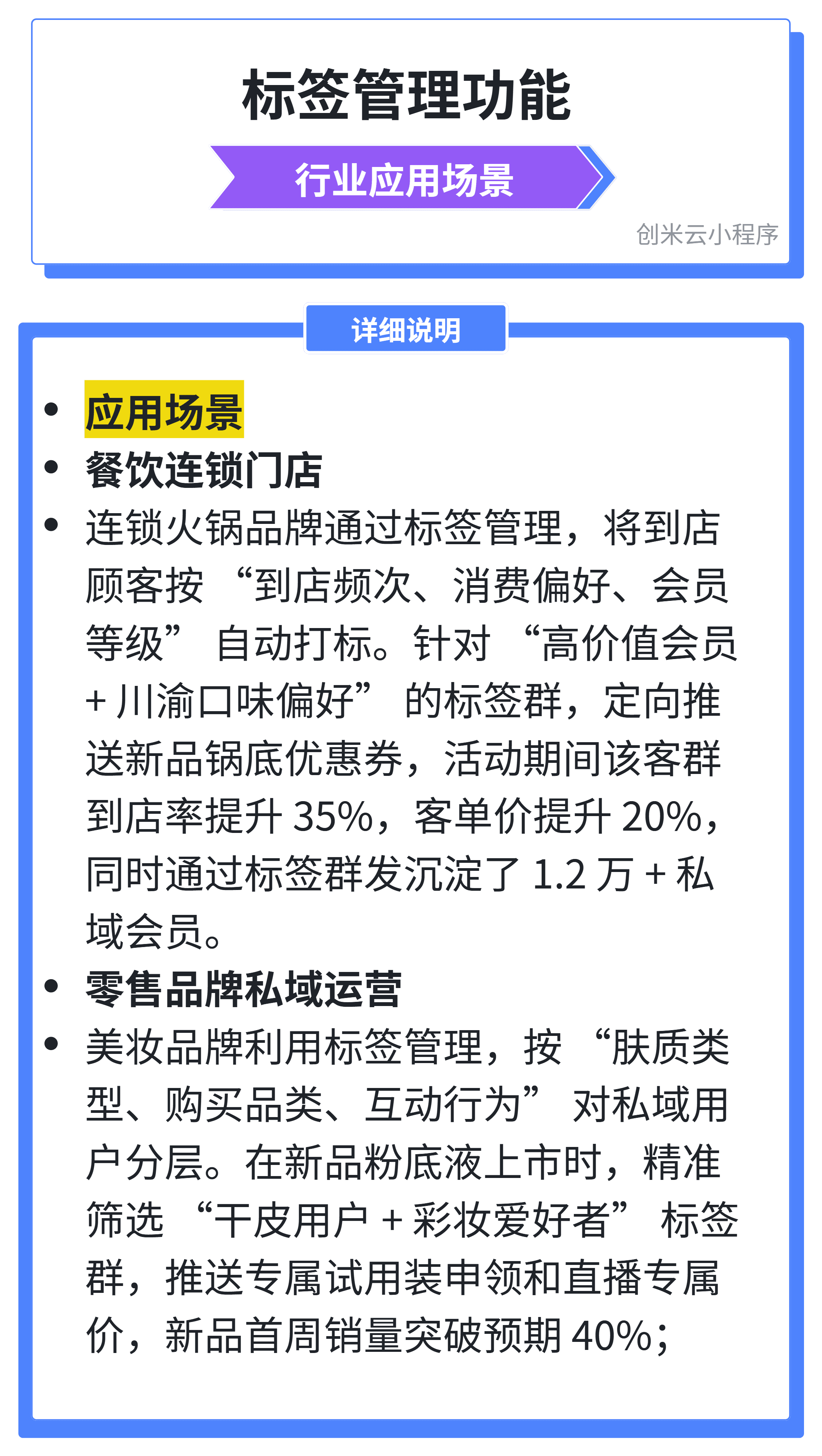 【创米云小程序——功能分享】标签管理,通过自动 + 手工双重打标,精准构建用户画像;支持标签群发、标签营销,高效触达目标客群,助力商家沉淀私域流量,实现精细化运营。