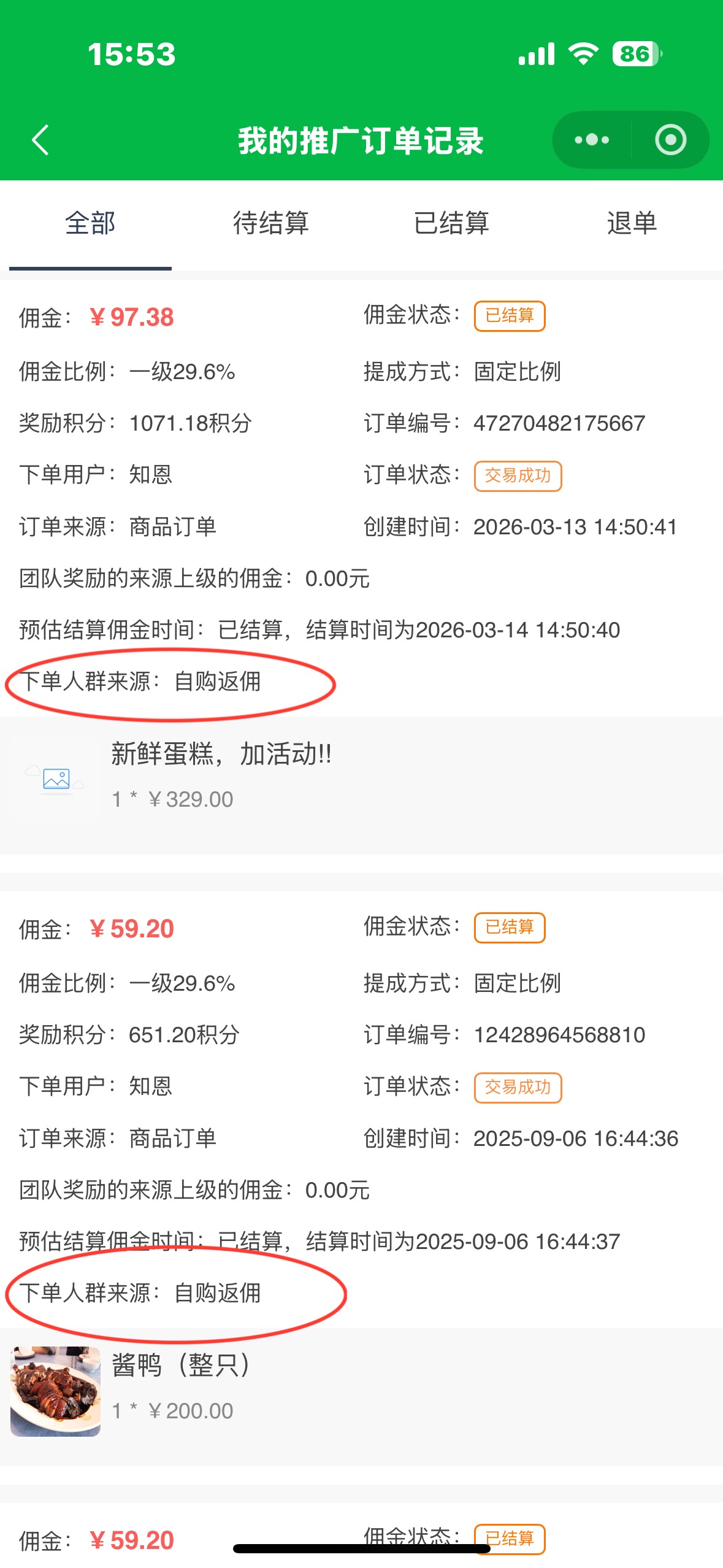 自购返佣:下单时根据商品返佣比例获得现金返还(如返10%订单金额)。