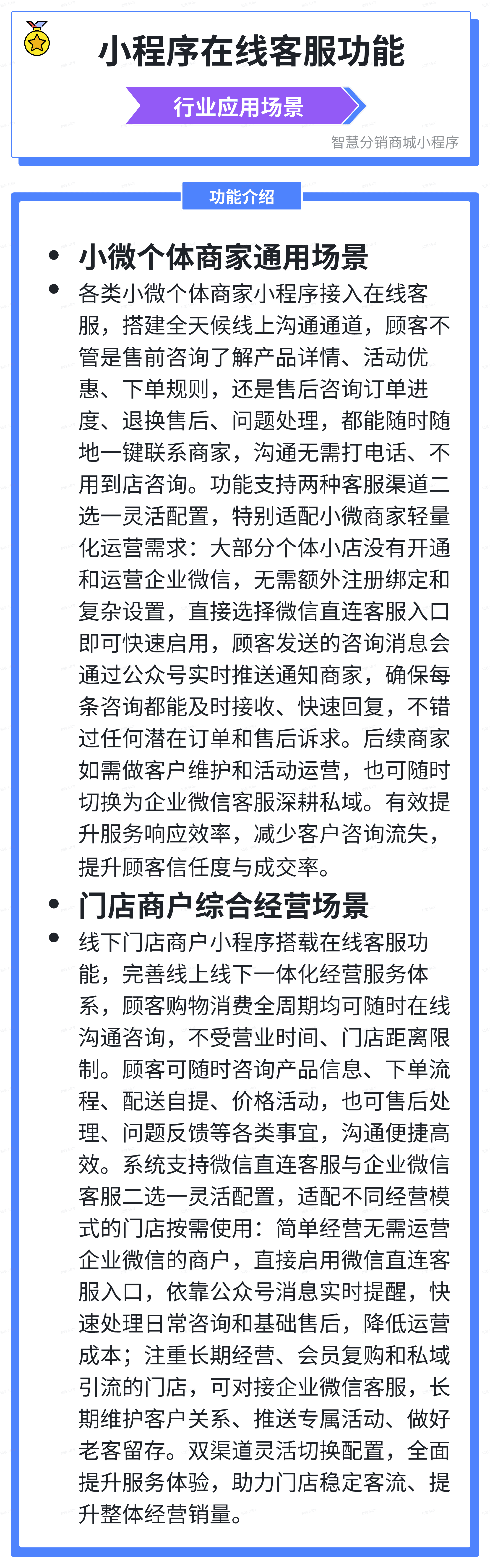 玩法:通过企业微信客服模式,将小程序用户咨询自动同步至企业微信工单系统,分配至对应部门跟进(如售后问题转交技术部)。